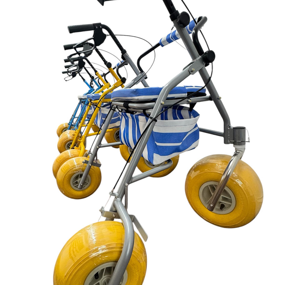 Les roues larges à crampons sont conçues pour répartir le poids de manière plus uniforme, empêchant le déambulateur de s’enfoncer dans le sable mou. Cela assure un mouvement fluide le long des plages ou des sentiers sablonneux. -